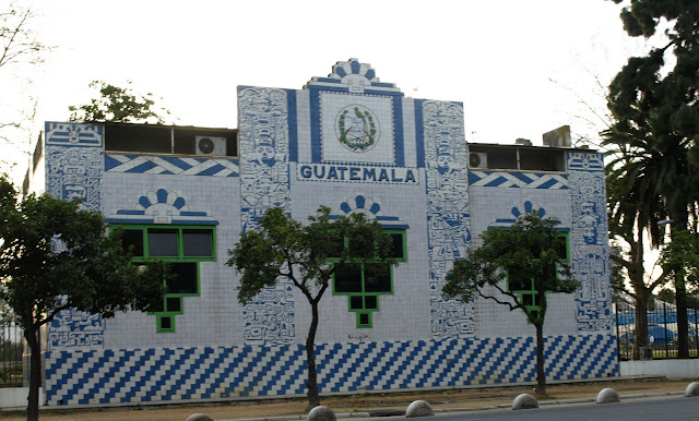 En 1929 se celebraba en Sevilla una Exposición Iberoamericana. Cada país participó con un edificio representativo de sus pueblos. En el caso de Guatemala, se apostó por este edificio blanco decorado con azulejos azules y motivos indígenas.